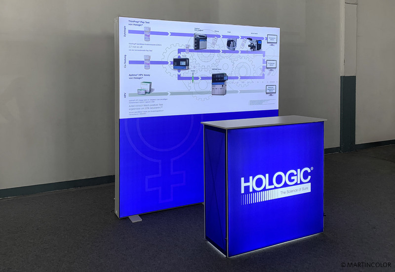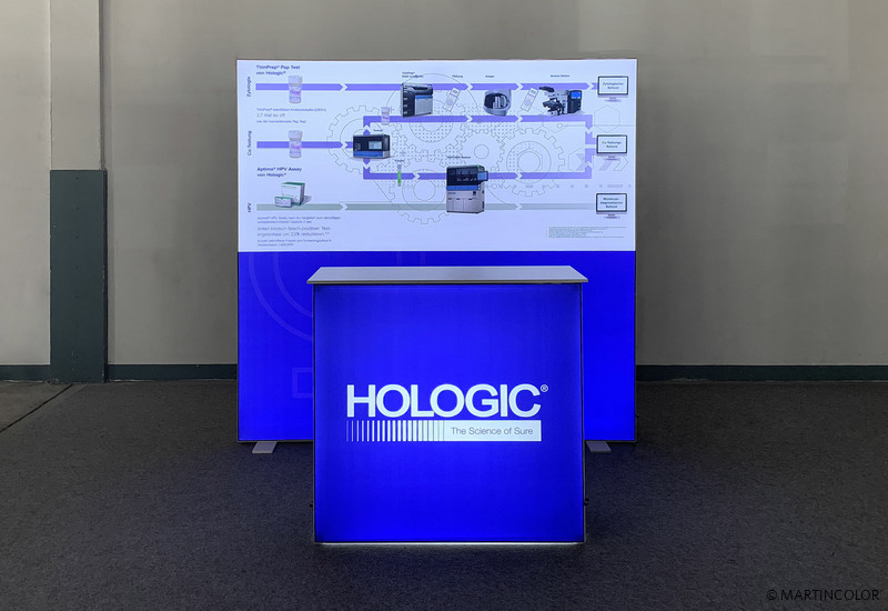 HOLOGIC ist ein führendes Unternehmen im Bereich Medizintechnik. Für die Veranstaltungen, Symposien und Kongresse benötigt das Unternehmen kleine, leicht zu transportierende Messewände. Bislang kamen hier die bekannten Scherengitterwände bzw. Faltdisplays zum Einsatz, die mit individuell bedruckten Magnetbahnen bespielt wurden. Der Wunsch unseres Kunden sich auf Messen noch innovativer zu präsentieren, führte zur Wahl eines LED-Messestandes. Aufgrund des einfachen Handlings, der hohen Strahlkraft der LEDs und des einfachen Transports fiel die Entscheidung zugunsten einer PIXLIP GO Leuchtwand und einer GRID Lightbox Theke. Beide Messesysteme lassen sich ideal miteinander kombinieren und kinderleicht mit einer individuellen Grafikbespannung versehen.