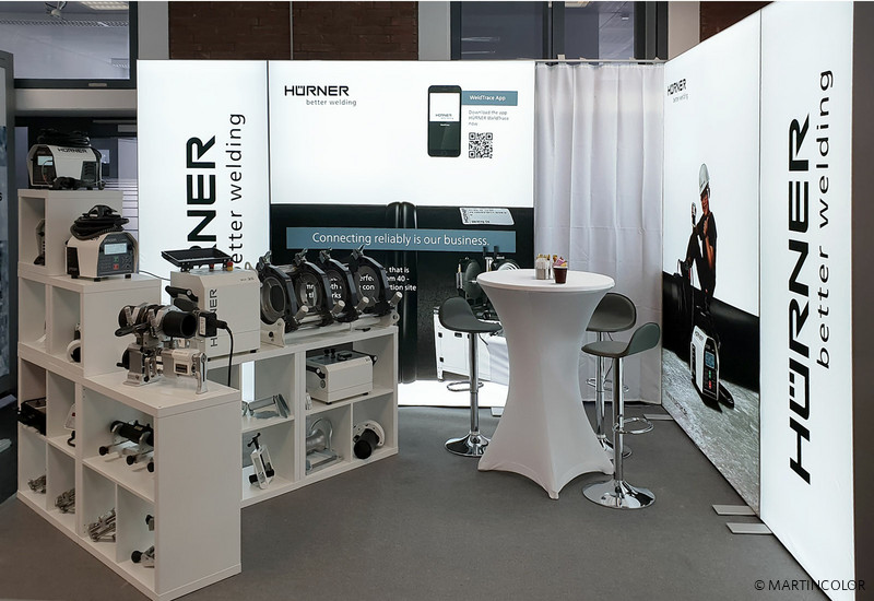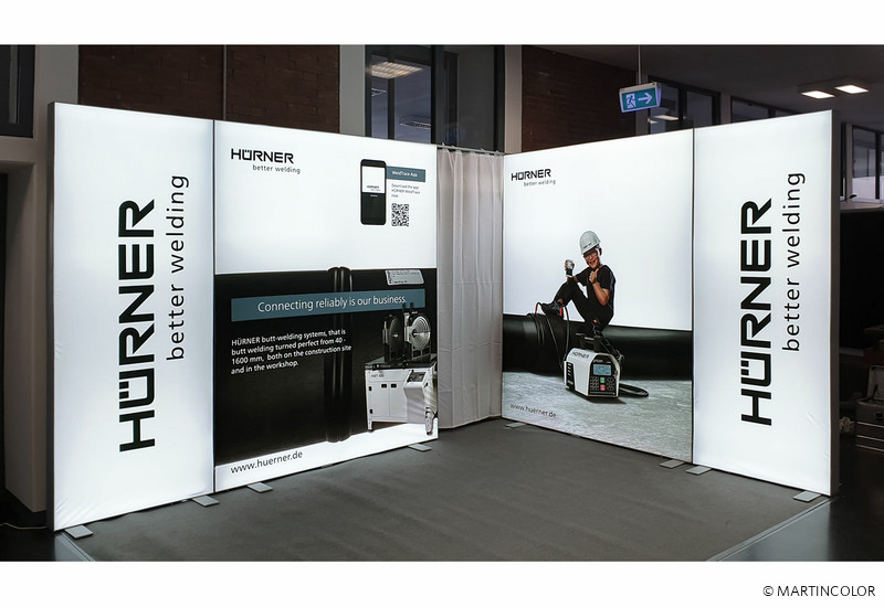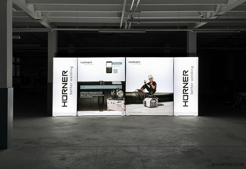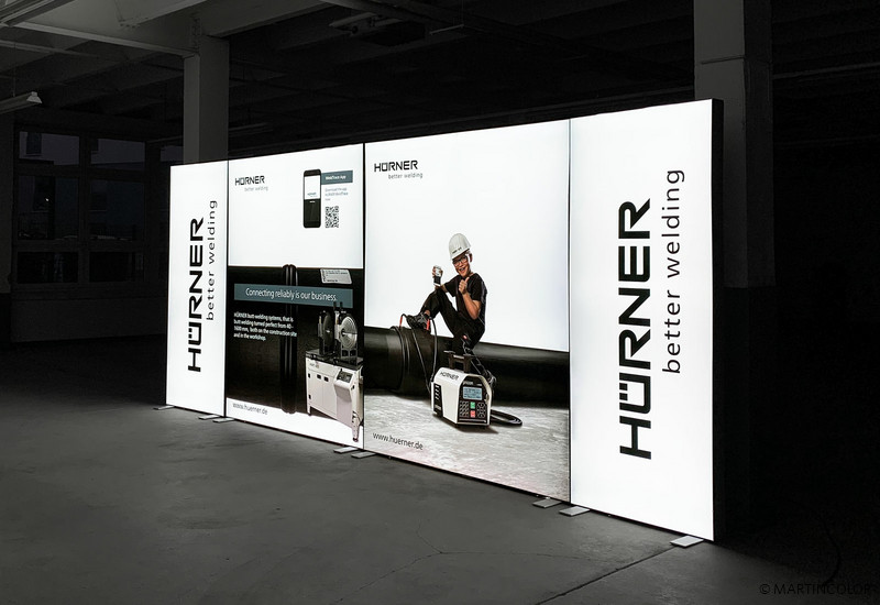 Hier sehen Sie den für die Hürner Schweisstechnik GmbH gefertigten, mehrteiligen LED-Messestand ALU STAR. ALU STAR ist der hochwertigste LED-Messestand aus unserem Programm und damit 100% passend für Kunden mit besonders hohen Anforderungen. Die LED-Messewand ALU STAR ist in vielen verschiedenen Großen lieferbar - bis zu einem maximalen Format von B: 500 cm und H: 300 cm! Durch die patentierte Stecktechnik, lassen sich solche großen Wände aber auch in ein kleineres Format umbauen. In den 12 cm breiten, aus hochwertigem Aluminium gefertigten Steckprofilen, sind die LED-Moduke und Trafos bereits fest eingebaut. Dies erleichtert die Systemmontage auf der Messe enorm. Viele unserer Kunden, so auch Hürner Schweisstechnik, entscheiden sich bei der Bildbespannung für unser faltbares Diamaterial, das besonders einfach im Handlich ist. Mehr Informationen zu ALU STAR finden Sie unter https://www.martincolor.de/messestaende/led-messestaende/alu-star.html