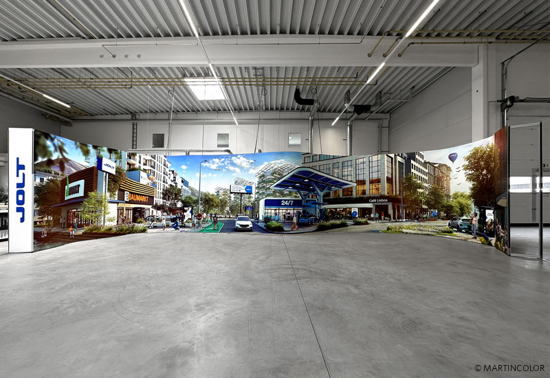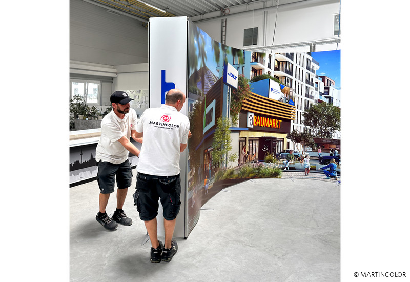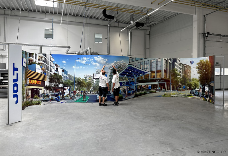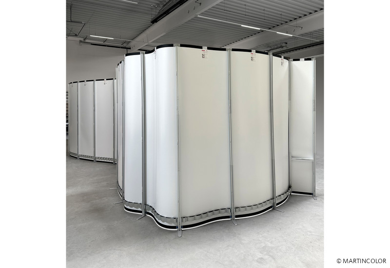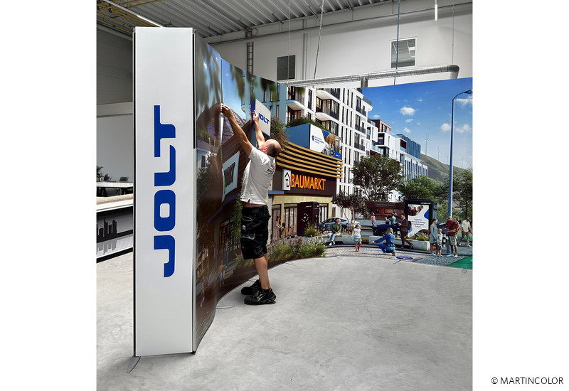 Dieses Ausstellungssystem mit seinen patentierten Flexi-Link-Verbindungen ermöglicht zahlreiche Stellmöglichkeiten in den gegebenen Räumlichkeiten. Es kann beliebig gebogen oder gestreckt werden. Die 20 à 80 cm breite Panels, die MARTINCOLOR für den Kunden „JOLT Energy GMBH“ produziert hat, hätten tatsächlich noch erweitert werden können, dank der Flexi-Link-Verbinder. Das ist der große Vorteil an diesem System. Natürlich kann dann das System mit Endkappen bestückt werden, um einen sauberen Abschluss zu erzielen. Die Montage erfolgt schnell, einfach und werkzeuglos. Dennoch steht Ihnen gerne unser Montageteam zur Verfügung, um den Auf- oder Abbau zu erledigen. Bei diesem flexiblen Messestand können Sie zusätzlich Regale, Tischelemente und/oder Monitore integrieren. Die ISOframe Wave ist in unterschiedlichen Größen erhältlich.