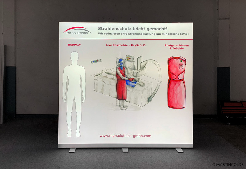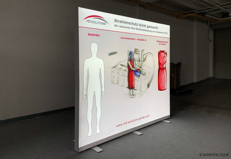 Für das Medizintechnik-Unternehmen MD Solutions GmbH fertigten wir eine großformatige Leuchtwand für den Einsatz auf Messen und Veranstaltungen an. MD Solutions MARTINCOLOR ist der Spezialist für Montage, Aufbau von Messe-Equipment und Befestigung von Werbung und Beschilderung in Ihrem Büro, auf Ihrem Messestand, auf Ihrem Event oder Veranstaltungen. Selbstverständlich übernehmen wir im Vorfeld auch die gesamte Gestaltung, Produktion und Fertigung der Messestände, Großbildflächen und Werbedisplays. Unser hochqualifiziertes Montageteam besteht aus Werbetechnikern, Malermeistern, Elektrikern und Schreinern. Je nach Anforderung werden diese für einen Montageeinsatz vor Ort zusammen gestellt. Wir montieren für Sie deutschlandweit: Acrylbilder, Textil-Spannrahmen, Tapeten, Büroleitsysteme, Fensterbeklebungen, Beschriftungen, Bau- & Werbeschilder, Fassadenbanner, Leuchtkästen uvm. Egal, ob in Ihrem Büro, bei Ihrem Kunden, auf dem Messestand oder Event (In- und Outdoor). Mehr Informationen und Preise erhalten Sie von unserem Spezialisten unter 069-756080-27.