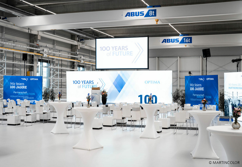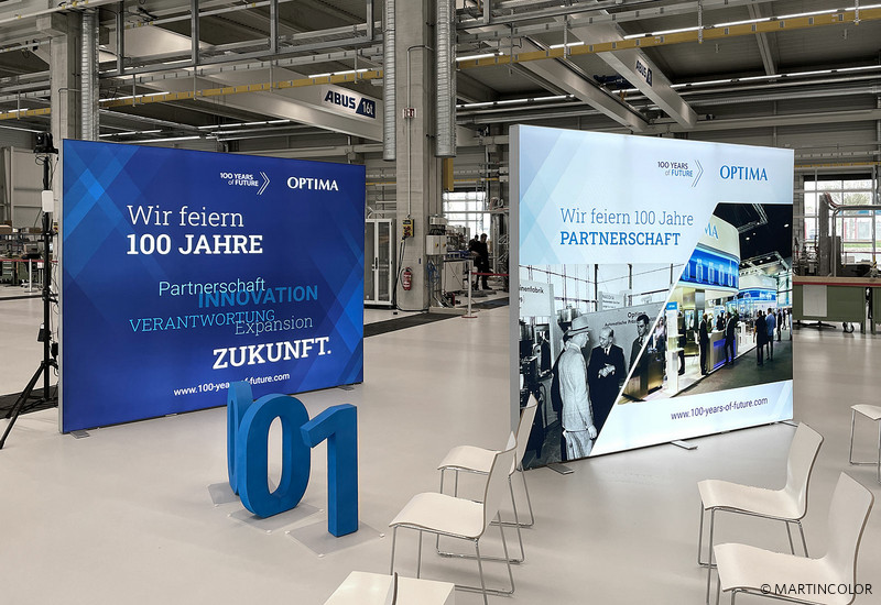 Sind die Räumlichkeiten noch so groß, die ALU STAR LED-Messewand gewährt Ihnen garantiert ein großes Auftreten! Das sieht man sehr gut beim Messestand der Firma OPTIMA packaging group GmbH. Unser Kunde hat sich ganz bewusst für diese LED-Messewände entschieden. Die Leuchtkraft der Power-LEDs, die bereits in den 12-cm-breiten Aluminiumprofilen integriert sind, schenkt auch großen Standflächen ein optimales Lichtschauspiel! Diese stabilen Rahmenkonstruktionen können entweder einzeln oder kombiniert eingesetzt werden. Je nach Wunsch kann jede Systembreite durch Erweiterungen um 50, 75 oder 100 cm erreicht werden. Zusätzlich lassen sich Monitorhalterungen, Brückenmodule und Türen problemlos integrieren. Auch Ihre textile Diabespannung kann „mitwachsen“.