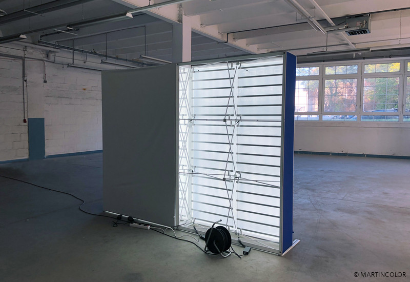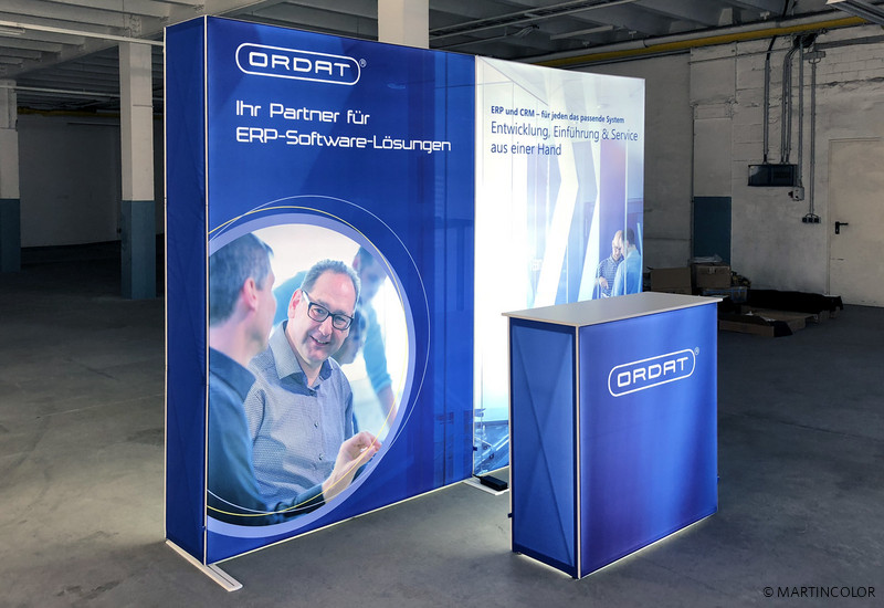 Einen modularen und leuchtenden Messestand produzierte MARTINCOLOR für die ORDAT GmbH & Co. KG. Hier war die Anforderung einen kleinen Messestand zu erstellen, der sowohl als kleine, 1,5 m breite Leuchtwand als auch als 3 m breite Leuchtwand eingesetzt werden kann. Die faltbare GRID Lightbox gibt es in 5 verschiedenen Wandformaten, sodass verschieden große Wände miteinander kombiniert werden können. Mit speziellen Adaptern kann man die Leuchtwände "über Eck" oder gerade miteinander verbinden. Eine pfiffige Kombination zu der Leuchtwand ist die leuchtende Theke GRID. Wie die GRID Lightbox auch, handelt es sich bei der Grundstruktur über ein faltbares Scherengitter, das sekundenschnell "aufgepoppt" werden kann. Rückseitig wird der eingespannte Grafikdruck von einer leistungsstarken LED Gardine durchstrahlt. Die Thekenplatte des GRID Leucht-Counters gibt es in silber und weiß.