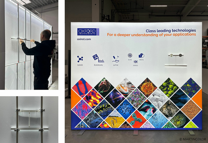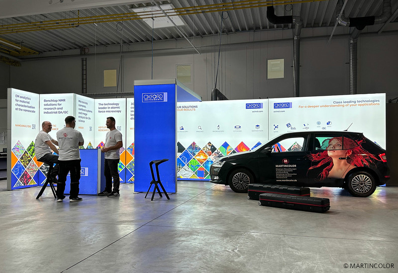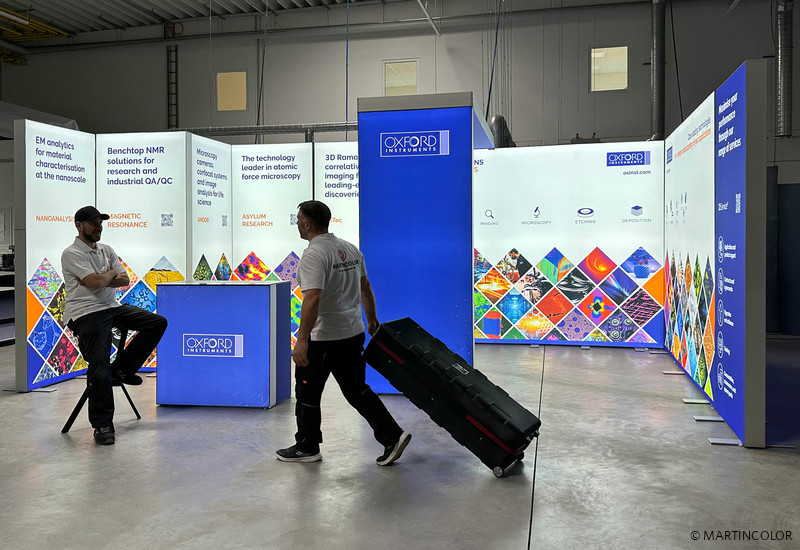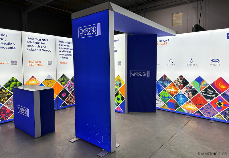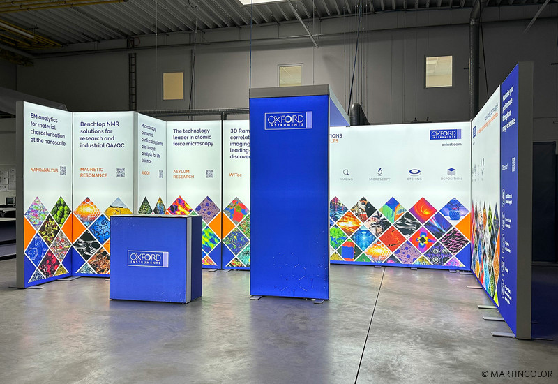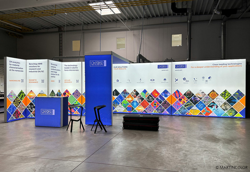 Für den Kunden „Oxford Instruments“ produzierte Martincolor den kompletten LED-Messestand ALU STAR mit der LED-Theke ALU STAR PLUS. Durch die bereits in den 12 cm breiten Aluminiumprofilen integrierten Power-LEDs ist das grandiose Lichtspektakel garantiert. Der absolute Hingucker ist das Brückenmodul. Besonders praktisch ist der mit einer Tür verschließbare Lagerraum.