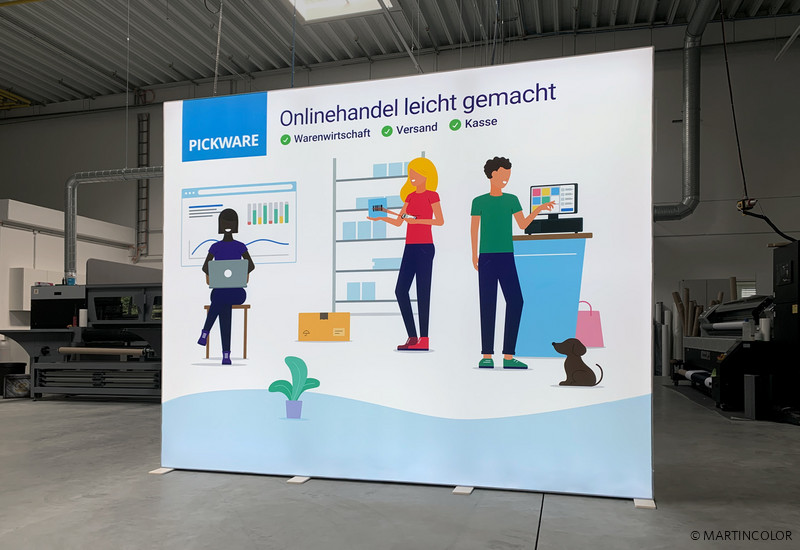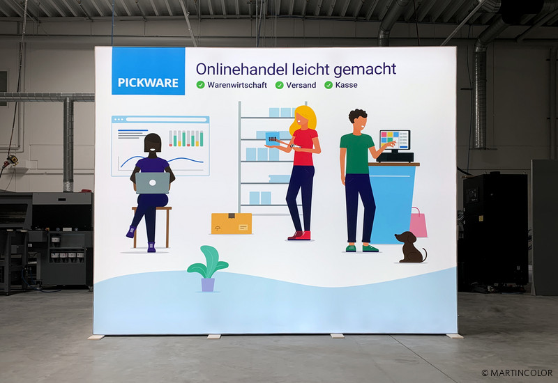 Die LED-Messewand für die PICKWARE GmbH ist besonders gut für ungeübte Aussteller geeignet, die sonst wenig mit Messesystemen zu tun haben. Bei dieser LED-Messewand handelt es sich um die "convenience" LED-Messewand PIXLIP GO. Dieses Leuchtsystem besteht aus weißen, 12 cm breiten Kunststoff-Profilen, die zum Aufbau einfach ineinander gesteckt werden. In den Profilen befinden sich bereichts die LED-Schienen.