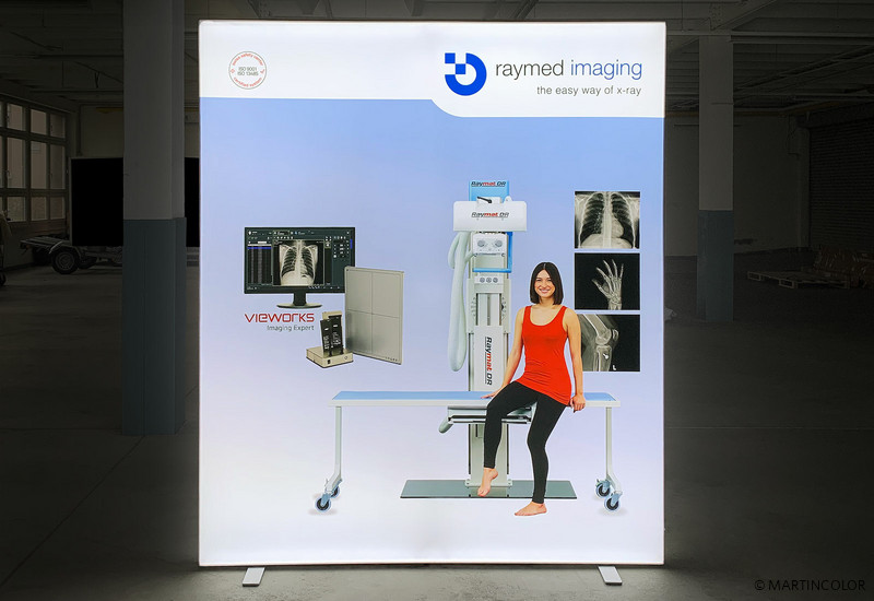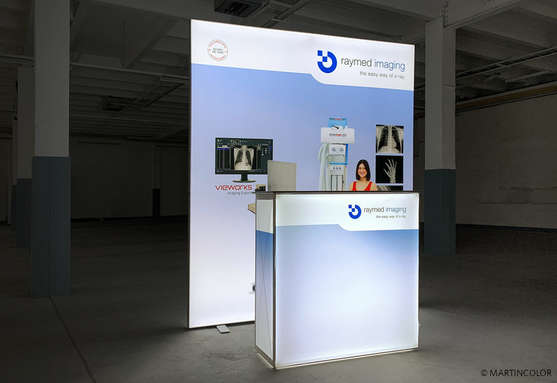 Raymed Imaging AG ist der führende Anbieter in der Schweiz für digitales Röntgen im Bereich der Human- und Veterinär-Medizin. Ein solch fortschrittliches Unternehmen legt auch bei Messepräsentationen besonderen Wert auf einen Messestand der innovativ und neuartig ist. Mit der Entscheidung für das LED-Messesystem ALU LightUp wählte Raymed Imaging ein modulares LED-Display, dass sich je nach Anforderung und Messe individuell einsetzen lässt. Mit unterschiedlichen Textildias ausgestattet, entsteht immer wieder ein neuer Eindruck. Der Aufbau der LED-Messewand ist denkbar einfach. Besonders praktisch: Der gesamte LED-Messestand kann in einem normalen PKW transportiert werden.