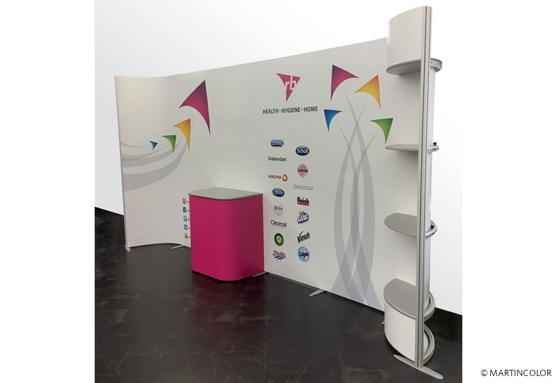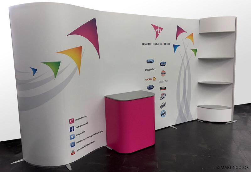 Das modulare Messestandsystem ISOframe Wave ist ein Verwandlungswunder! Das Messesystem ist unglaublich flexibel und bietet extrem viele Möglichkeiten beim Messestandbau. So lassen sich mit einem ISOframe Messesystem die unterschiedlichsten Messestände umsetzten. Egal, ob Sie einen gebodenen, geraden oder wellenförmigen Messestand wünschen. ISOframe Wave lässt sich durch die patentierten Flexi-Link-Verbinder in jede gewünschte Form biegen. Unser Kunde Reckitt Benckiser war auch begeistert davon, dass man den ISOframe Messestand modular um Teilstücke von jeweils 80 cm erweitern kann. So kann man dieses Messestandsystem auch für unterschiedliche Messestand-Größen einsetzten. Das macht diese Messestandlösung nicht nur optisch eindrucksvoll in der Wirkung sondern auch sehr effektiv und kostengünstig! ISOframe Wave kann zudem vom Kunden selber ohne Werkzeug aufgebaut werden. Jeder ISOframe Wave Messestand verfügt über umfangreiches Zubehör wie Regalsysteme, Prospekthalter, Monitorhalterungen, Baldachin, Vitrinen, uvm.