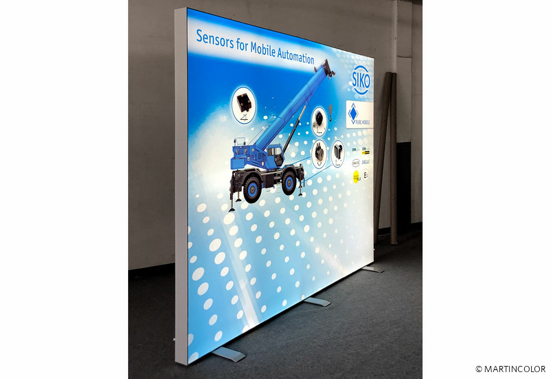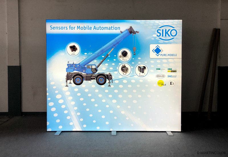 Besonders hochwertig sind leuchtende Messestände von OCTANORM. Das Grundsystem besteht aus einem 12 cm breitem Aluminiumprofil in dem leuchtstarke LEDs vormontiert sind. Die Systemgröße kann individuell nach Kundenwunsch gefertigt werden. So sind auch großformatige XXL-Leuchtwände umsetzbar. Für den Hersteller von Messgeräten und Positioniersysteme SIKO, fertigten wir eine OCTAlumina Leuchtwand im Format B: 300 cm und H: 250 cm. Die Bespannung mit Diamaterial erfolgte doppelseitig.