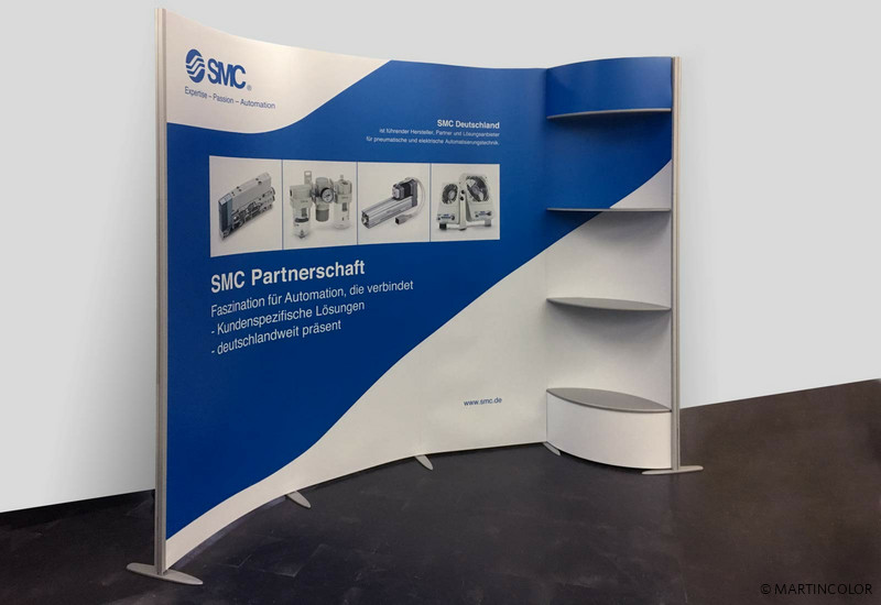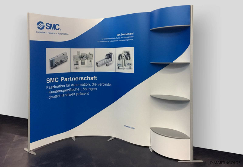 SMC ist der führender Lösungsanbieter, Partner und Hersteller für pneumatische und elektrische Automatisierungstechnik. Für Messen und Veranstaltungen suchte die SMC nach einem flexiblen und modularen Messestandsystem. Bei dem modularen Messestandsystem ISOframe Wave wurde man fündig, denn es hat den Vorteil, dass es sich individuell an die jeweiligen Messegegebenheiten anpassen lässt. Möglich wird das durch ein patentiertes Flexi-Link, das als Verbinder zwischen den senkrechten Systemstützen dient. So lässt sich die Präsentationswand je nach Einsatzzweck gerade, wellenförmig oder gebogen einsetzen. Auch die Systembreite von ISOframe Wave kann individuell bestimmt werden, da ISOframe Wave aus jeweils 80 cm breiten Modulen besteht, die aneinandergereiht werden. An diesen Modulen werden mittels Magneten die Grafikbahnen mit Ihrer Werbebotschaft befestigt.