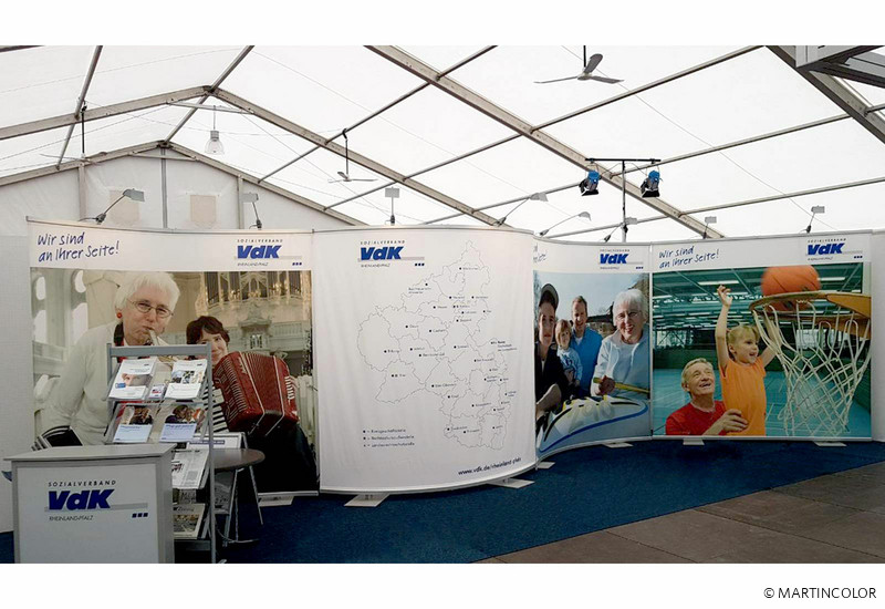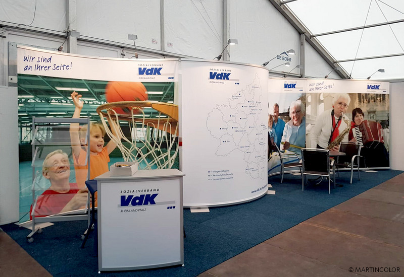 Wenn Systemtechnik gefragt ist, die sich individuell an die Größe und Form einer Messestandfläche anpassen lässt, entscheiden Sie sich mit MARTINCOLOR für den richtigen Partner. Wir haben viele modulare und flexible Messestand-Systeme in unserem Angebot, z.B. OCTApole, ISOframe Wave, Expolinc Miracle oder Expand LinkWall. Jedes dieser Messewand-Modelle weist unterschiedliche Vorteile auf. Der Sozialverband VdK Deutschland e.V. entschied sich bei seiner Messestand-Umsetzungen für die OCTApole Messewand des schwäbischen Herstellers OCTANORM. Dei OCTApole handelt es sich um ein Aluminiumkeder-System, bei dem der individuell bedruckte Stoff zwischen zwei Kederschienen gespannt wird. Die Kederschienen gibt es in unterschiedlichen Formen und Längen, sodass der Messestand in Form und Größe variabel eingesetzt werden kann.