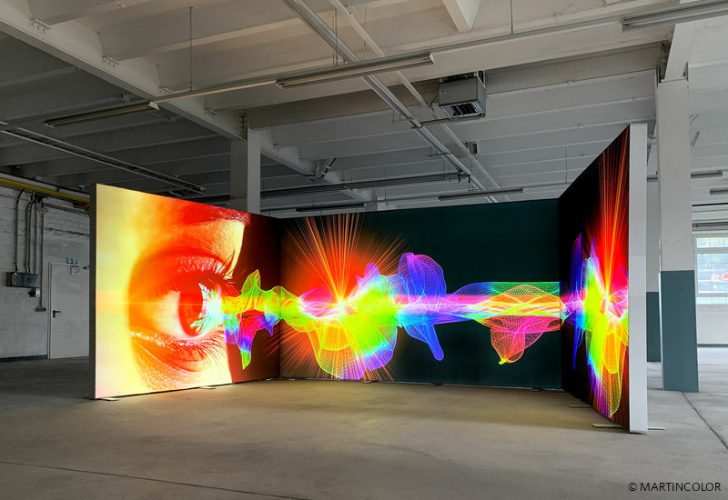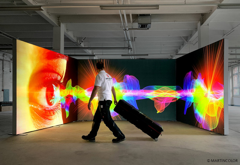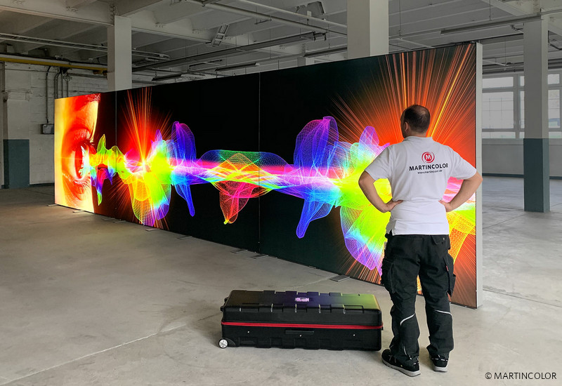 Beeindruckend in der Wirkung ist die leuchtende Messewand, die wir für Systemtechnik Hölzer gefertigt haben. Die hier gezeigte LED-Messewand besteht aus drei ALU STAR Leuchtwänden in der Breite von 1 x Breite 375 cm und 2 x 275 cm. Werden die Lichtwände zusammen gestellt, entsteht eine LED-Messewand von über 20 m² Gesamtfläche. Bespielt wurde die Lichtwand mit faltbarem, textilem Diamaterial. Ein großer Vorteil und deshalb auch für Selbstaufbauer geeignet ist, dass ALU STAR Leuchtwände durch einfache und werkzeugfreie Steckverbindungen aufgebaut werden können. Der Transport der aus stabilen, 12 cm tiefen Aluminiumprofilen gefertigten Messewände erfolgt in einem robusten und leichten ABS-Rollkoffer, der sich auch im normalen PKW transportieren lässt. Mehr Informationen zu ALU STAR finden Sie unter https://www.martincolor.de/messestaende/led-messestaende/alu-star.html