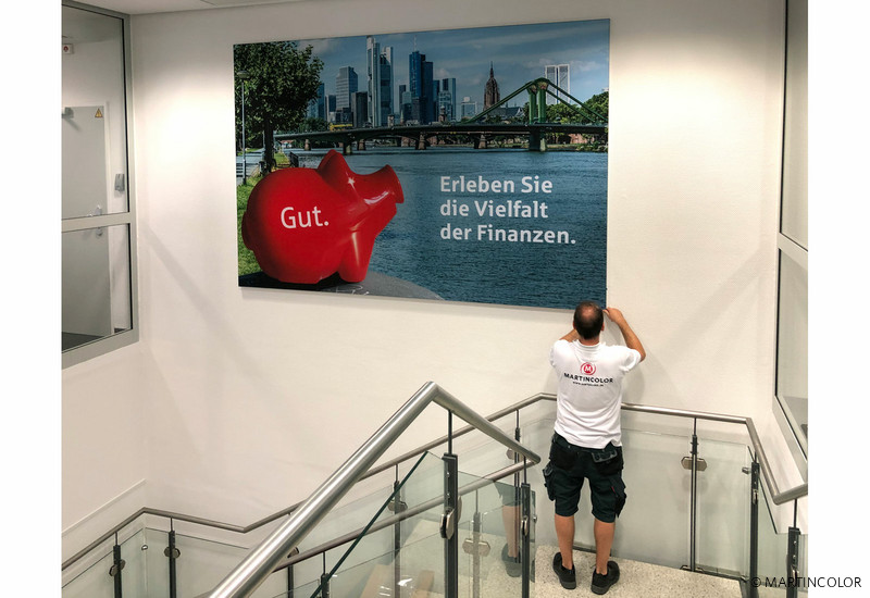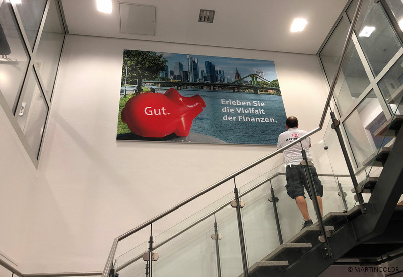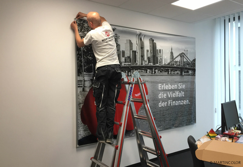 Für die Frankfurter Sparkasse produzierten wir großformatige Textilspannrahmen in verschiedenen Formaten. In unserer Werkstatt werden Aluminiumrahmen in jedem Wunschformat gefertigt und anschließend konfektioniert. Der Druck der individuellen Bespannung erfolgt 4-farbig über Sublimationsverfahren auf unterschiedliches Textilmaterial. Durch die Bespannung der Rahmen mit Textildrucken, kann das Motiv immer wieder einfach ausgewechselt werden. Auch der Transport der textilen Bespannung ist denkbar einfach, denn sie ist unempfindlich und kann klein zusammen gefaltet verschickt werden.