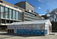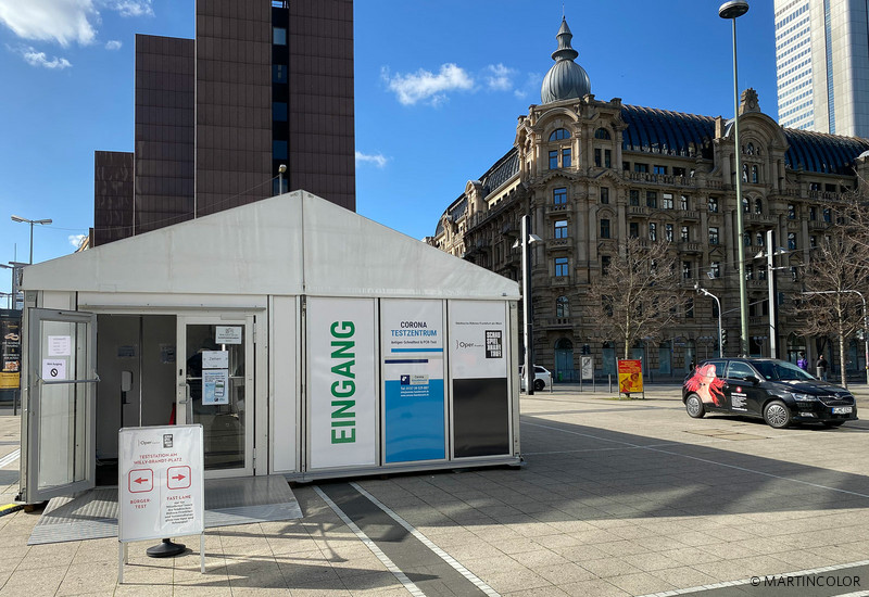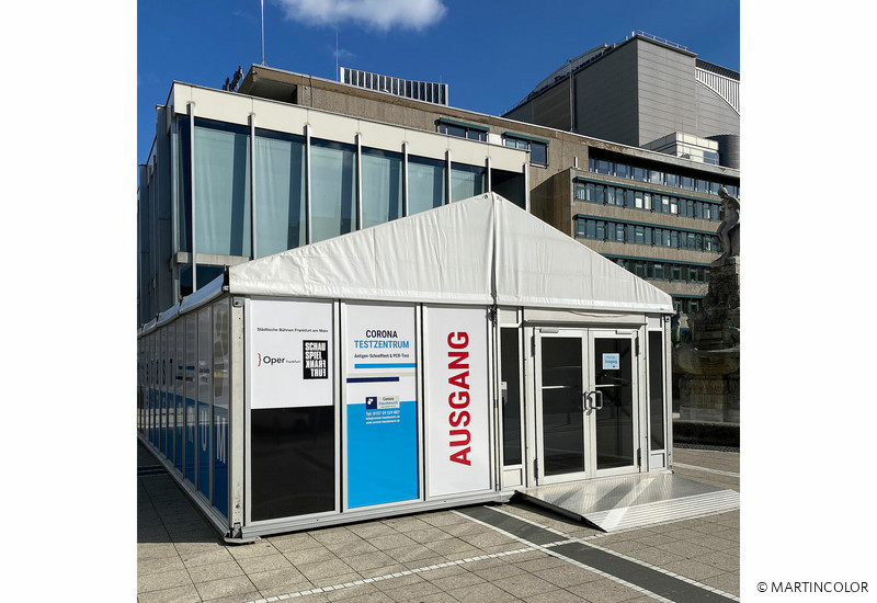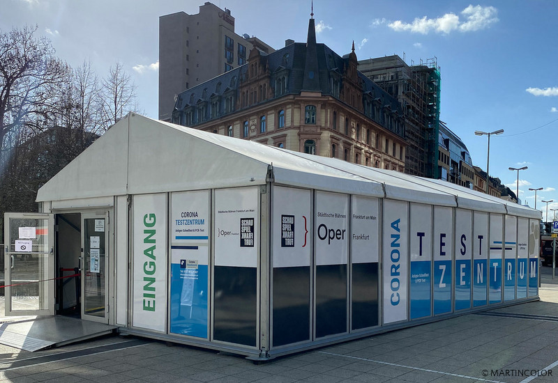 Aktuell wie noch nie: das Corona Test-Zentrum direkt vor der Oper, bzw. vor dem Schauspiel am Willy-Brand-Platz in Frankurt. Sie haben jetzt die Möglichkeit sich ganz bequem vor dem Opern- oder Theaterbesuch testen zu lassen. Für die Städtischen Bühnen hat MARTINCOLOR das Branding für das CORONA Testzentrum gestaltet und produziert. Das professionelle Montage-Team hat die Grafikbahnen vor Ort montiert. Durch die Neugestaltung bekommt das Zelt eine besondere Farbnote und fällt auf dem Platz sofort auf.
