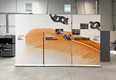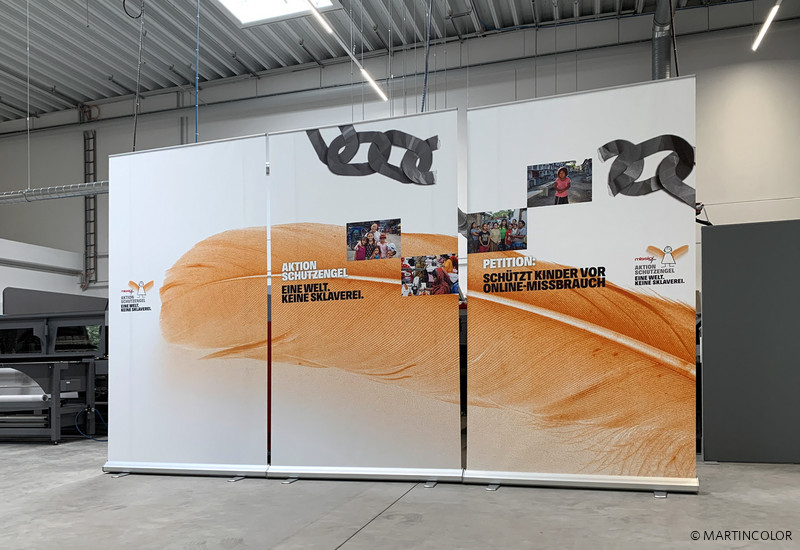 Neben großformatigen Rückwänden werden als Hintergrund für Videokonferenzen gerne auch großformatige RollUp-Systeme eingesetzt. Hier sehen Sie z.B. drei megahohe RollUps Extreme mit dem Maß H: 300 cm x B: 150 cm. Zusammen gestellt ergeben die drei RollUps eine Rückwand von 14 m². Beachten Sie jedoch, dass RollUps nicht anschlußfrei nebeneinander positioniert werden können. Es ergibt sich zwischen den Systemen immer ein Spalt von etwa 5 cm. Bei Fragen informieren Sie sich gerne unter Tel. 060-756080-84.
