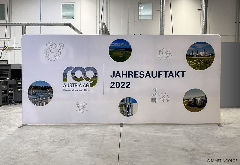 ZippWall Rückwände sind perfekt für Videokonferenzen geeignet. Diese mobilen Wandsysteme sind in vielen verschiedenen Größen erhältlich. Hier sehen Sie z.B. eine Rückwand, die für eine Online-Pressekonferenz von RAG Austria erstellt wurde. Sie ist 5 m breit und 2,3 m hoch. Die maximale Systembreite unserer ZippWalls beträgt 6 m. Das flexible Rückwandsystem wird mit einem völlig reflexfreiem Textilmaterial bespannt. Der Aufdruck mit einem individuellen Bildmotiv kann ein- oder doppelseitig erfolgen.