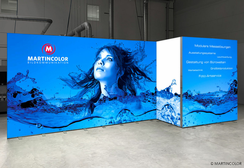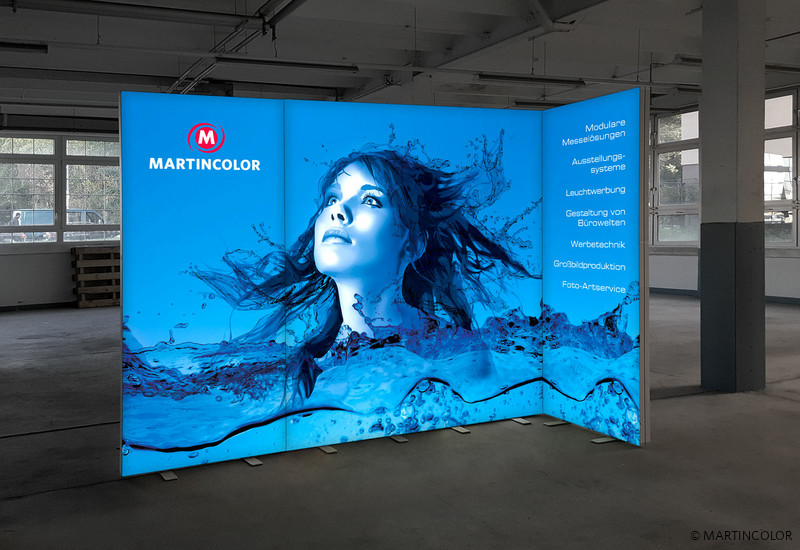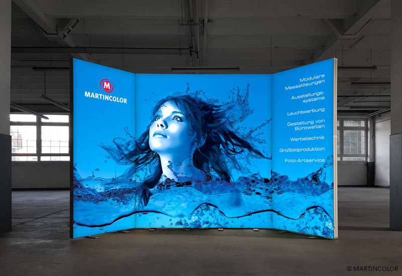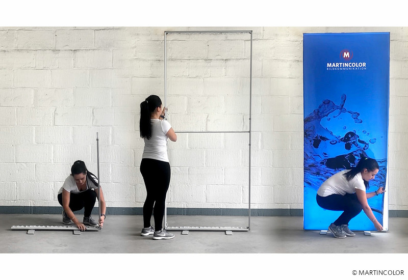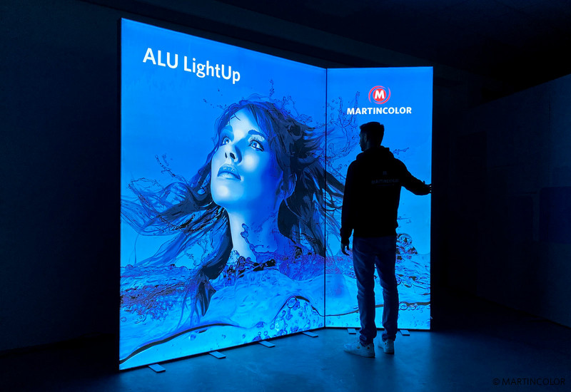 ALU LightUp ist das erste mobile und kostengünstige LED-Display aus Aluminium. Das Grundsystem besteht aus einem 8 cm breiten Aluminiumprofil das werkzeugfrei zusammengesteckt wird. In den Aluminiumprofilen befinden sich die vormontierten LED-Module, was den Aufbau des Leuchtdisplays besonders einfach macht. Die individuelle Bespielung des Leuchtdisplays erfolgt auf textiles Diamaterial einfach in der umlaufenden Systemnut eingesteckt wird. Besonders praktisch ist, dass sich die textilen Drucke sekundenschnell auswechseln lassen und so das Leuchtdisplay immer mit einer aktuellen Werbebotschaft bestückt werden kann. ALU LightUp ist in den Breiten 85, 100 und 200 sowie in den Höhen 200, 230 und 250 cm lieferbar. Natürlich können auch mehrere ALU LightUp-System nebeneinander positioniert werden, damit eine leuchtende Wandabwicklung oder ein leuchtender Messestand entsteht. Der Transport von ALU LightUp erfolgt in einer praktischen Transporttasche, die in jeden Kofferraum passt.