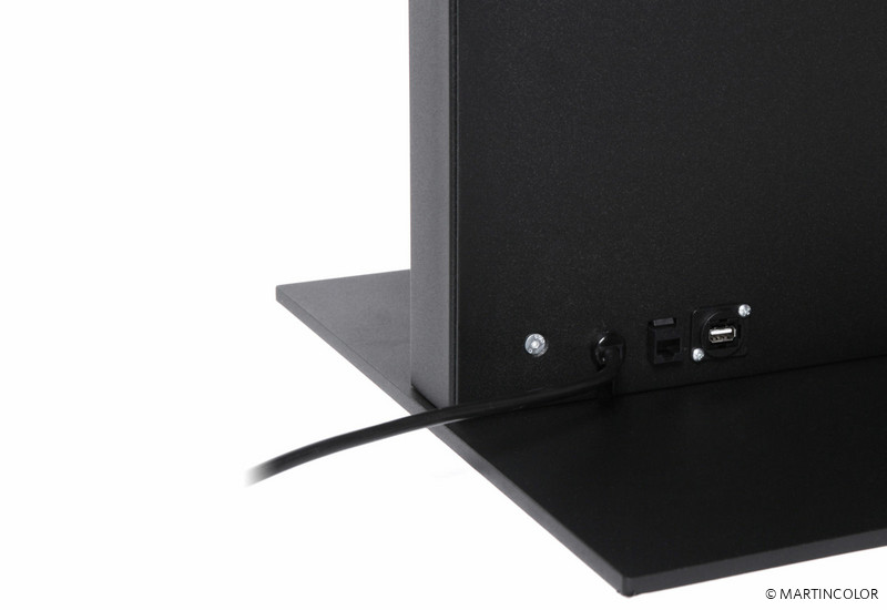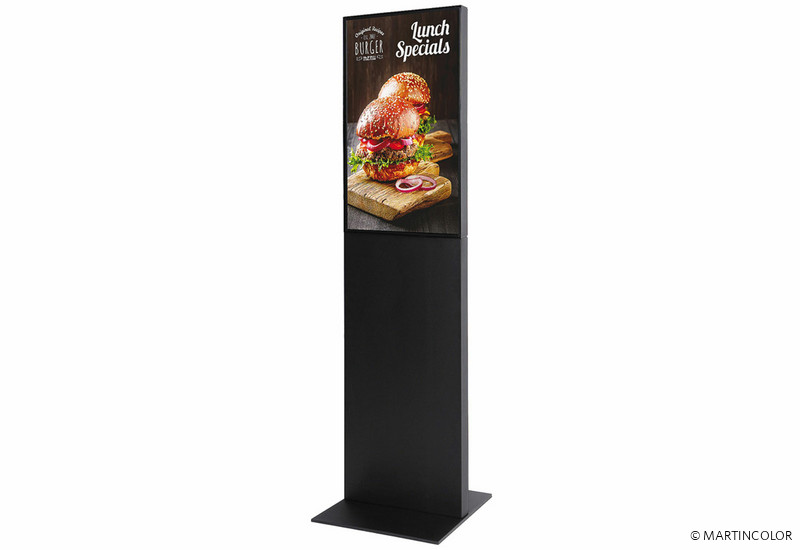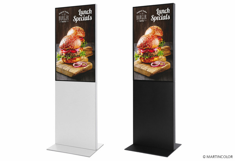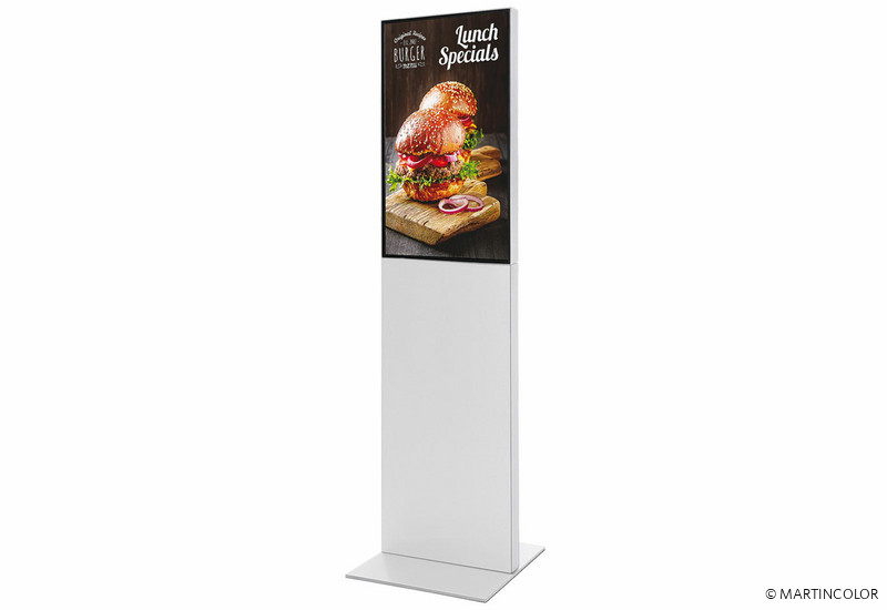 Die digitale Infostele „SMART“ präsentiert sich mit einer eleganten, rahmenloser Monitor-Konstruktion. Das 7,5 cm tiefe Rahmenprofil, das seitlich sichtbar ist, besteht aus eloxiertem Aluminium. SMART ist in den Standardfarben Schwarz oder Weiß lieferbar. Andere RAL-Farben sowie ein individuelles Logo-Branding fertigen wir gerne auf Anfrage. Integriert im SMART Corpus befindet sich ein Samsung Monitor der QMR Serie, in der Größe 43". Die schwere Sockelbasis, aus einer 8 mm dicken Stahlplatte, sorgt für stabile Standsicherheit. Dabei ist es möglich, die Basis der Infostele mit Schrauben am Boden zu befestigen. Der WLAN fähige Monitor besitzt in der Standardausstattung einen USB-Anschluss. Die digitale Infostele SMART kann nicht mit einer Touchscreen Funktion ausgestattet werden. Mehr Informationen und Preise erhalten Sie von unserem Spezialisten unter 069-756080-84.
