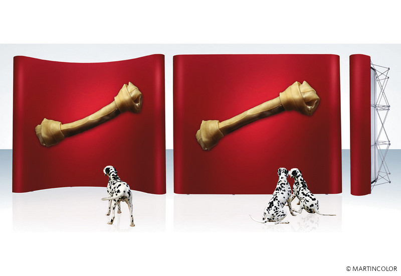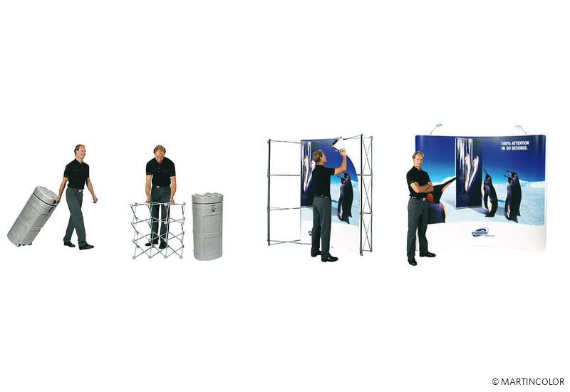 Das PopUp-Faltdisplay ist in verschiedenen Größen und Formen erhältlich. Verbindet man mehrere gerade und gebogene Expolinc Faltwände miteinander, kann so ein vollwertiger Messestand konstruiert werden. Dieser flexible Messestand kann dann immer wieder den Messegegebenheiten angepasst werden. So entsteht eine hochwertige, schnell aufzubauende Messelösung.