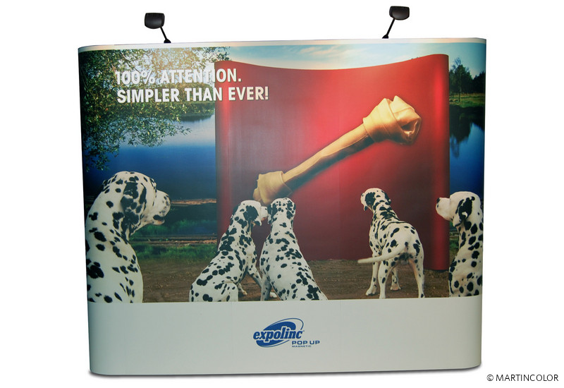 Expolinc Faltdisplays gehören zu den Faltsystem-Klassikern. Das Grundgerüst der PopUp-Faltwand von Expolinc besteht aus einem faltbaren Scherengittersystem, an dem individuell bedruckte Grafikpanels mittels Magnetstreifen angebracht werden können. Durch die patentierte Systemtechnik ist innerhalb weniger Minuten eine leicht gewölbte Präsentationswand mit Ihrer Werbebotschaft einsatzfertig aufgestellt.