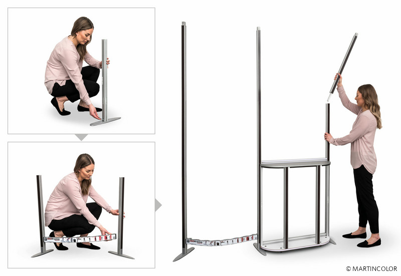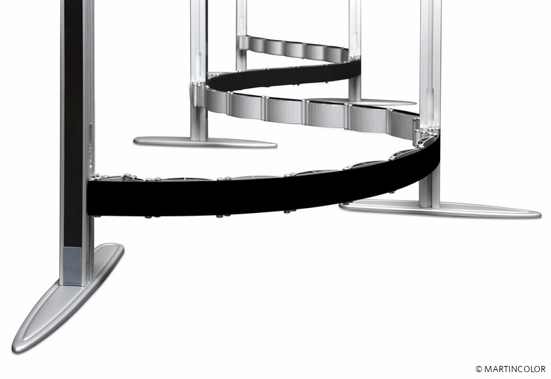Die patentierte Flexi-Wellen-Verbindung sorgt auch beim Biegen und Dehnen des Displays bis zu 180° für maximale Standstabilität. Mit passenden Extension-Modulen lässt sich ISOframe beliebig um jeweils 80 cm breite Einheiten verlängern. Dank der Schnell-Klemm-Verbindungselemente ist die Montage werkzeuglos durchführbar. Zusätzliche Träger ermöglichen das Anbringen von Regalen, Tischelementen, TFT- oder LCD-Bildschirmen. ISOframe wave ist in zwei Höhen erhältlich: 2290 mm (Midi) und 2480 mm (Maxi).