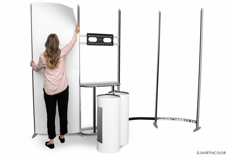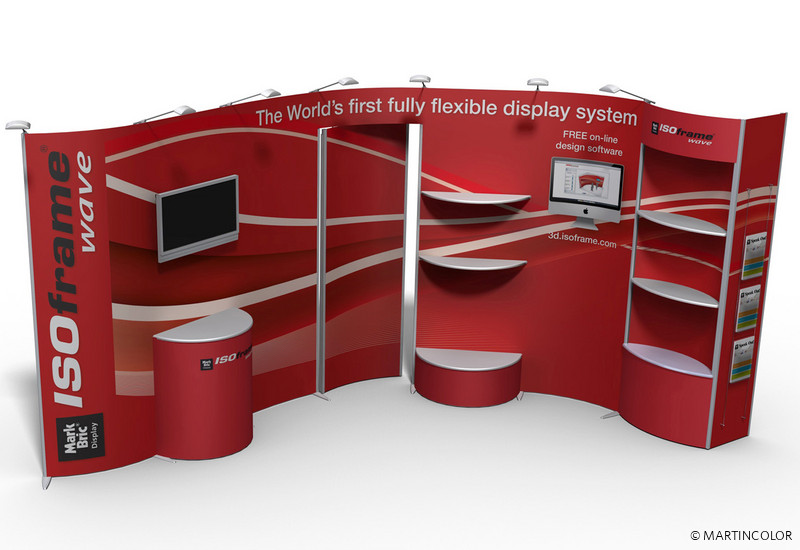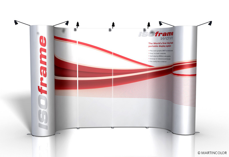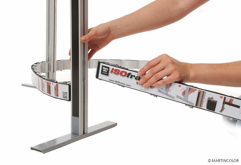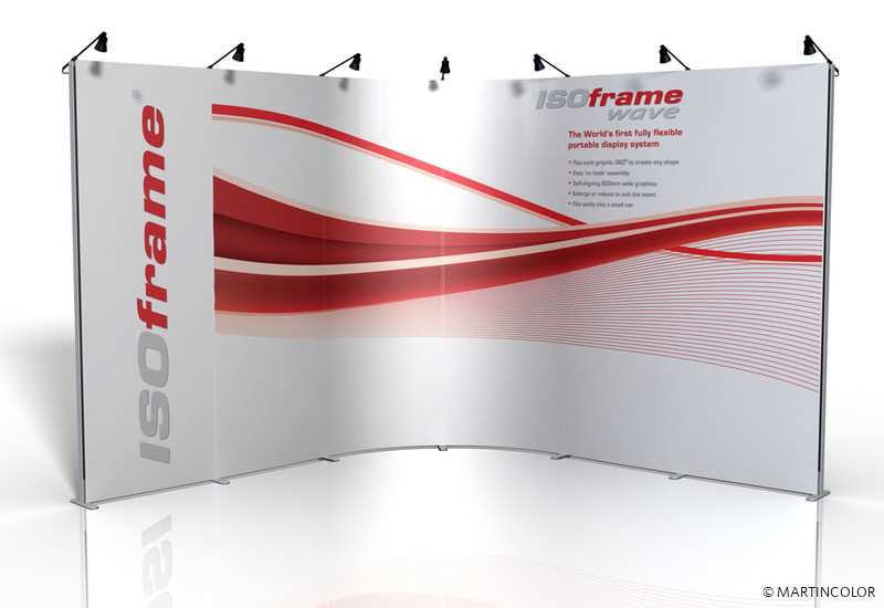 ISOframe wave eröffnet völlig neue Möglichkeiten für Ihren Messestand. Das Ausstellungssystem mit der patentierten Flexi-Link-Verbindung lässt sich in fast jede gewünschte Form bringen – ganz nach Bedarf und den gegebenen Stellmöglichkeiten. Je nach Einsatz und Anforderung werden beliebig viele Flexi-Link-Verbinder aneinandergefügt, das Gestänge hineingesteckt und das gesamte Display in die gewünschte Form gebogen.