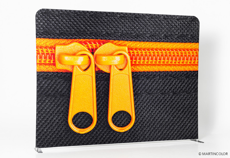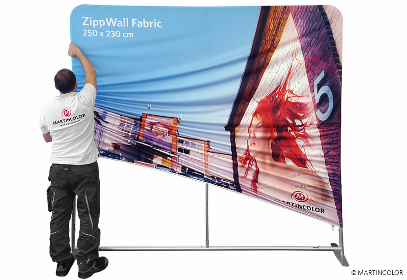 Unsere Rückwand ZippWall ist für viele Einsatzzwecke geeignet. Sie ist ideal als günstige Messewand geeignet oder als Hintergrund für Videokonferenzen und Online-Meetings. Die ZippWall Rückwand ist in vielen verschiedenen Größen und Formen lieferbar. Das System besticht durch kinderleichten Aufbau und kann somit auch von unerfahrenen Aussteller installiert werden. Kurz beschrieben: Man steckt die beschrifteten Click-Systemstangen ineinander. Über den so entstandenen Rahmen wird der individuelle Grafikdruck, so einfach wie man einen Strumpf anzieht, hinübergezogen. Dann den Reißverschluss zuziehen und schon ist man fertig! Das Gerüst der ZippWall besteht aus Aluminium, der hochwertige Textildruck aus B1-zertifizierten, reflexfreiem und knitterarmen Stretch-Displaystoff. ZippWall Rückwände überzeugt zudem durch ihr geringes Transportgewicht. Der Transport erfolgt bei vielen Systemgrößen in einem Trolley. Für einige Systemgrößen steht eine Transporttasche zur Verfügung. LED- oder Halogenleuchten können zusätzlich bestellt werden.