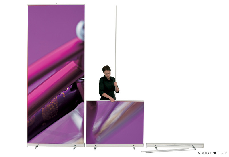 Das neue Expand MediaScreen XL ist ein extra hohes und breites RollUp-Display. Es wurde speziell für einen größeren Betrachtungsabstand konzipiert. Durch spezielle Magnetverbinder können mehrere XL-RollUps an den oberen Profilen miteinander verbunden werden, sodass ein großes Gesamtbild ersteht. So ergeben z.B. drei Displays eine Gesamtbreite von 3,60 m, bei einer Höhe von bis zu 3 m! Expand MediaScreen XL ist perfekt geschaffen für die Hintergrundgestaltung von Firmenlogos, Bildern und Marketingbotschaften. Auf Grund der besonderen Höhe ragt Ihre Botschaft über der Ihres Wettbewerbers hinaus. Das Expand MediaScreen XL kann in weniger als einer Minute aufgebaut werden und wird in einer praktischen Nylontasche geliefert. Bei Bedarf kann kann der Grafikdruck natürlich durch einen neuen, aktuelleren Druck ersetzt werden. So kann ein und dasselbe System über viele Jahre hinweg eingesetzt werden.