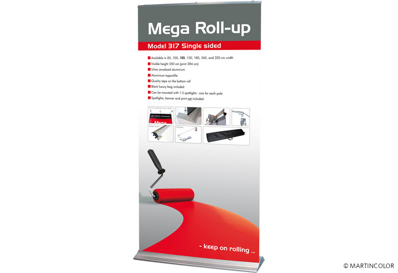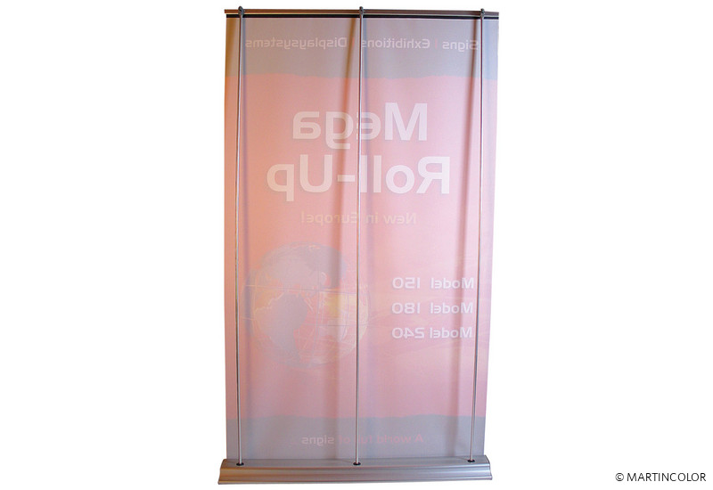 Das neue MegaRollUp ist das einzige qualitativ hochwertige RollUp-System für Großformatdrucke auf dem Markt. Mit möglichen Breiten von 85, 100, 119, 149, 179, 238 und sogar 317 cm ist die Formatauswahl fasst unbegrenzt. Durch eine Systemhöhe von 250 cm fällt das RollUp auch auf Messen besonders ins Auge. Durch den einfachen Pull-Up Mechanismus ist es sekundenschnell aufgebaut.Ab einer Breite von 150 cm verfügt das RollUp rückseitig über 3 Stangen, was dem System und der Grafik eine hohe Standfestigkeit verleiht. Bei Bedarf kann kann der Grafikdruck natürlich durch einen neuen, aktuelleren Druck ersetzt werden. So kann ein und dasselbe System über viele Jahre hinweg eingesetzt werden.