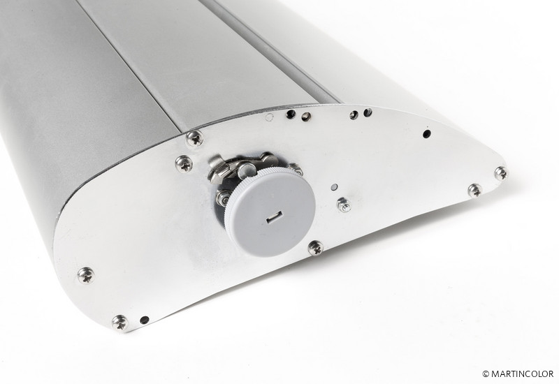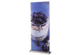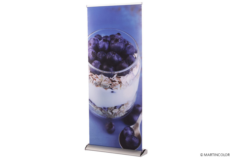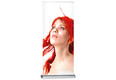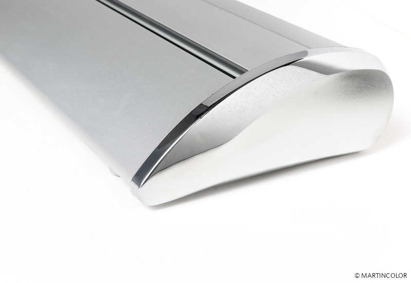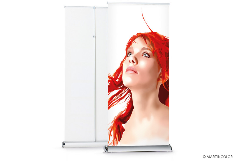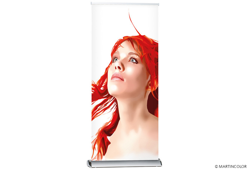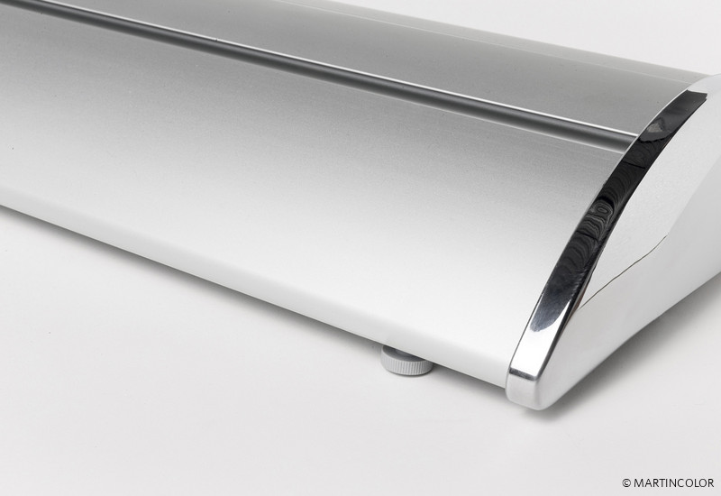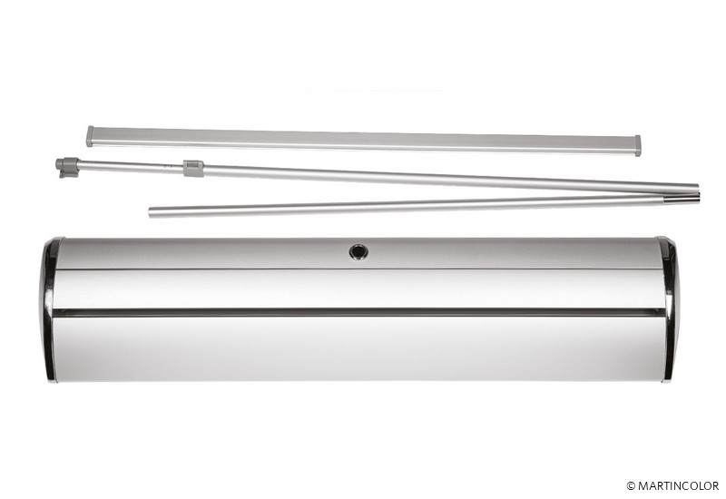 Bei dem RollUp Deluxe handelt es sich um ein hochwertiges und formschönes RollUp-System. Die Aluminium-Systemkassette verfügt über verchromte Seitenteile und hat einen überaus sicheren Stand.. Das System besitzt an der Unterseite kleine, drehbare Stellfüße, wodurch das System völlig gerade gestellt werden kann. Der Grafikdruck befindet sich geschützt im Standfuß des Systems und wird durch einfaches "Herausziehen" präsentiert. Die Fixierung der Grafik erfolgt durch eine rückseitige Teleskopstange (mögliche Systemhöhe dadurch von 160 cm bis max. 225 cm). Ein besonderer Vorteil ist die Möglichkeit, den integrierten Grafikdruck selber leicht wechseln zu können, da das System sowohl oben als auch unten in der Systemkassette über eine Klemmschiene verfügt. Das System wird inklusiv einer doppelt gefütterten Transporttasche ausgeliefert. Der Grafikdruck erfolgt wahlweise auf B1 zertifiziertem Bannersoft-Material 720 dpi, Aluminiummaterial oder Aluminiummaterial mit kratzfester Schutzfolienbeschichtung 1200 dpi. Bei Bedarf kann kann der Grafikdruck natürlich durch einen neuen, aktuelleren Druck ersetzt werden. So kann ein und dasselbe System über viele Jahre hinweg eingesetzt werden.
