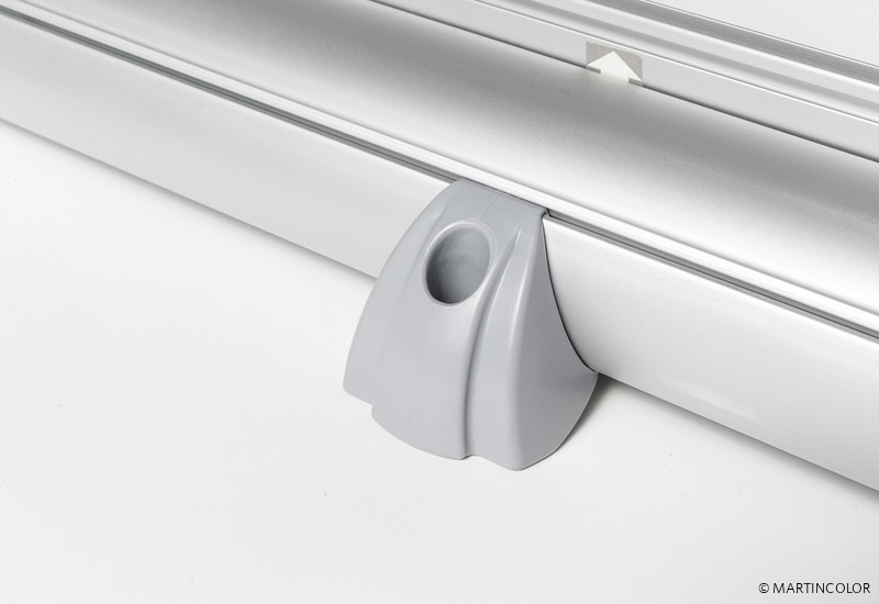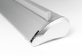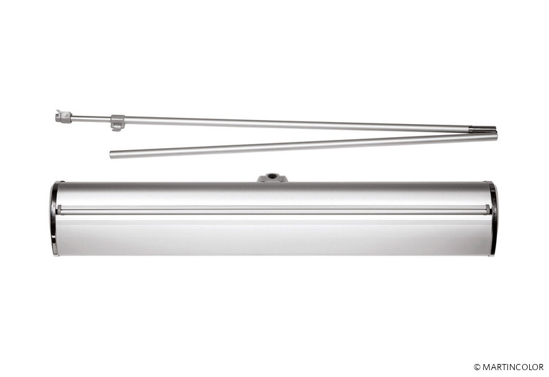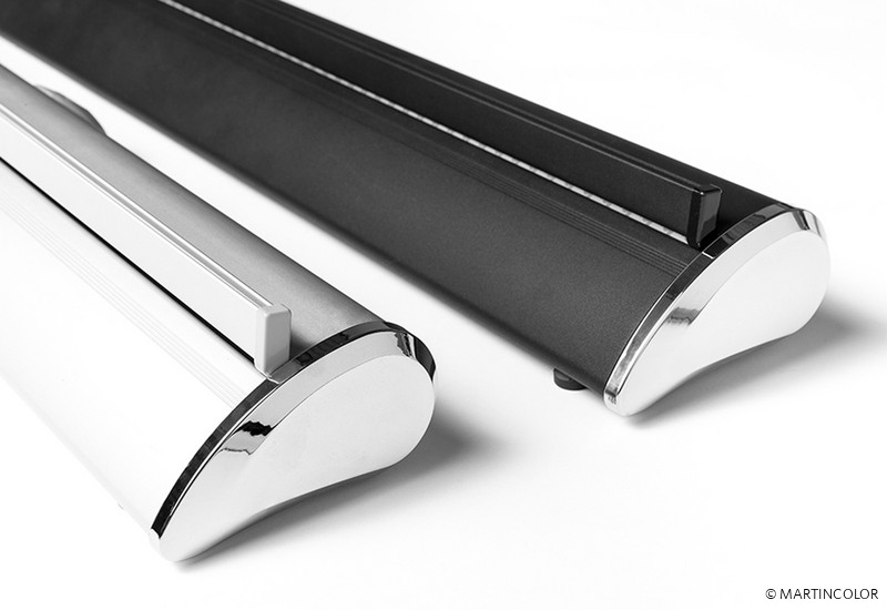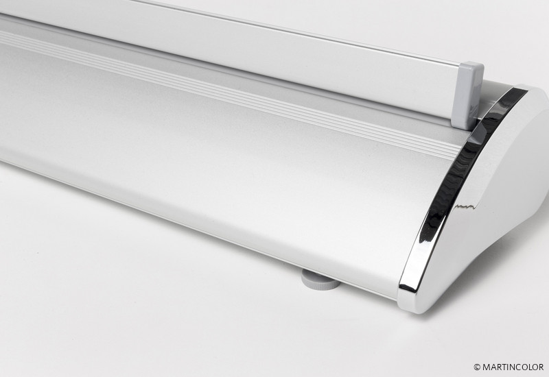 Das neue RollUp PRO kombiniert hochwertiges Design mit einem günstigen Preis. Die stabile Aluminium-Systemkassette verfügt über verchromte Seitenteile und hat einen überaus stabilen Stand. Das System besitzt an der Unterseite kleine, drehbare Stellfüße, wodurch das System völlig gerade gestellt werden kann.