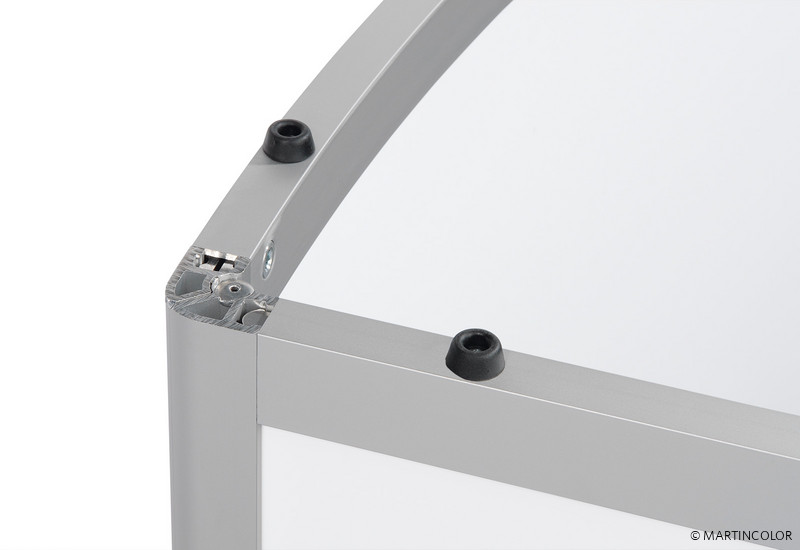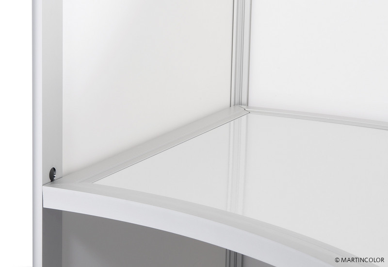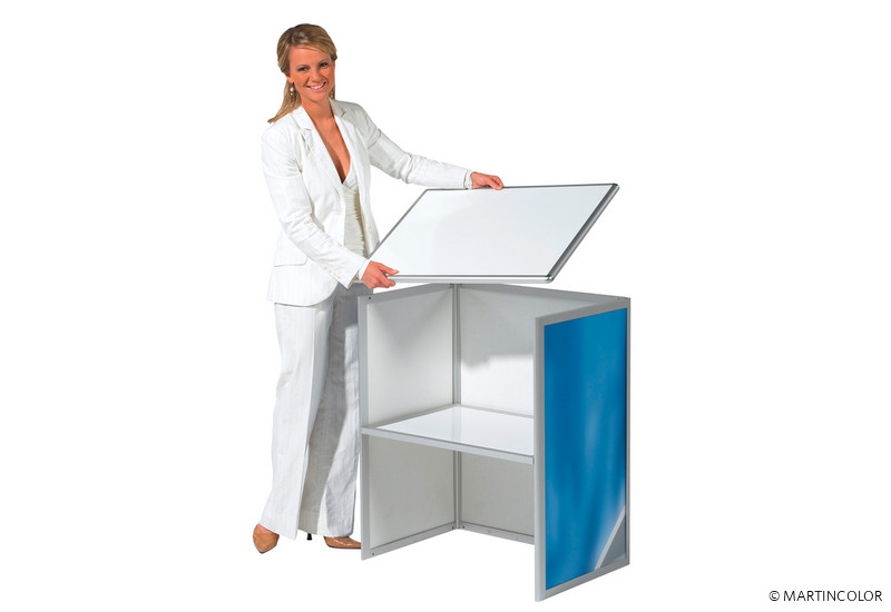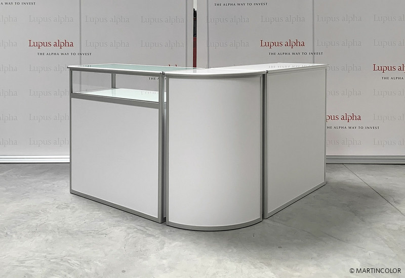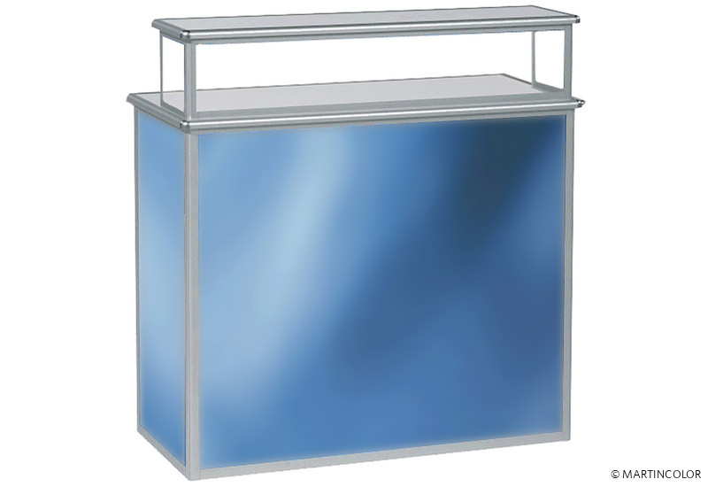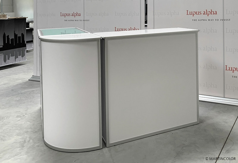 ALU-PRO Counter sind hochwertige und im Design ansprechende, faltbare Countertheken, die es in verschiedenen Formen und Größen gibt. Durch die einfache Falttechnik lassen sich alle Modelle kinderleicht auf ein transportfähiges Maß zusammenfalten. Hochwertige Aluminiumprofile mit abgerundeten Kanten, gerahmte Ablagen und durchgehende Scharniere lassen keine Kompromisse zu. Alle Modelle verfügen über einen intigrierten Ablageboden. Die Systeme mit gerade Rückwand lassen sich auf Wunsch zusätzlich mit abschließbaren Türen versehen. Counter ALU-PRO Theken sind problemlos von einer Person aufzubauen, natürlich ganz ohne Werkzeug. Front und Seitenpanels sind individuell mit Grafikdruck bestückbar. Ideal für Veranstaltungen, Messen und Verkaufsbereich.