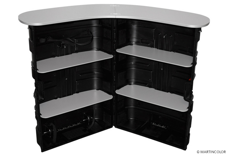 Der neue, kostengünstige Counter Case ist ein rollbarer Transportkoffer und Theke in einem. Durch die Öffnung der Transportbox entsteht eine geräumige Theke. Die Vorderseite der Theke steht für Ihre Werbegrafik zur Verfügung. Diese wird einfach um die Box gezogen und mit Klettverbindern fixiert. Im Paket wird standardmäßig eine silberne Theken-Abdeckplatte und ein Einlegeboden-Set für die Theken-Rückseite mitgeliefert. Die Grafikbahn und die Ablagen finden ebenfalls in der geschlossenen Box sicheren Platz während des Transportes. Die Theke ist ideal für den Einsatz auf Messen und Veranstaltungen, bei denen nicht ausreichend Stauraum zur Verfügung steht.