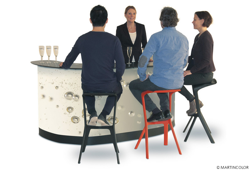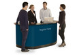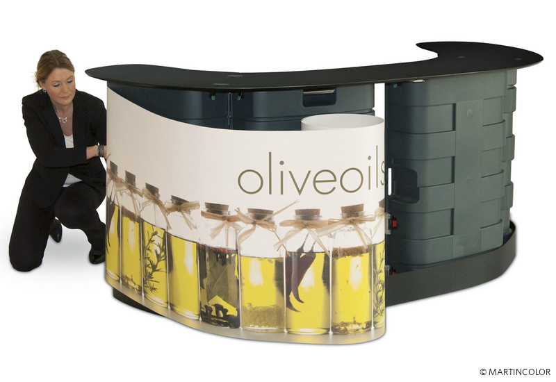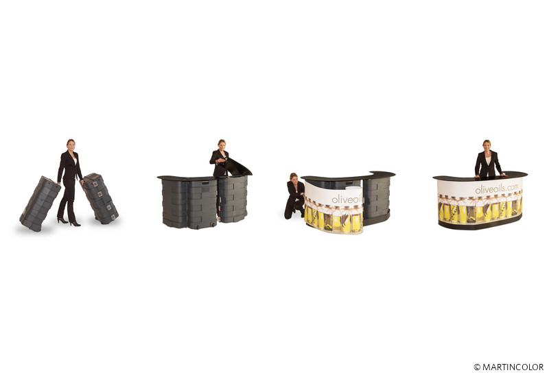 Zwei Expand PodiumCase Boxen können zu einer extra großen Theke verwandelt werden können. Dazu brauchen Sie nur die Boxen zu öffnen und durch Montage der schwarzen Thekenplatte diese miteinander verbinden. Anschließend werden die Sockelblende, die großflächige Thekenummantlung und die Einlegeböden angebracht. Die Theke bietet einen geräumigen Stauraum bei Messen und sonstigen Veranstaltungen. Auf der Rückseite der Theke befinden sich herausnehmbare Regale, die optional hinzu bestellt werden können. Diese bieten ausreichend Stauraum für Ihre Broschüren und anderes Werbematerial. Für den bequemen Transport sind die Thekenkoffer mit Rollen ausgestattet.