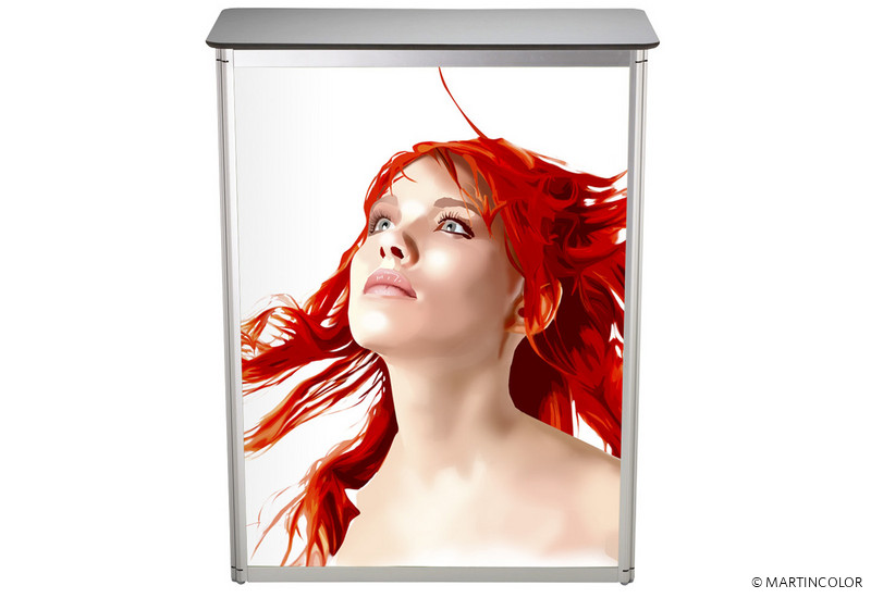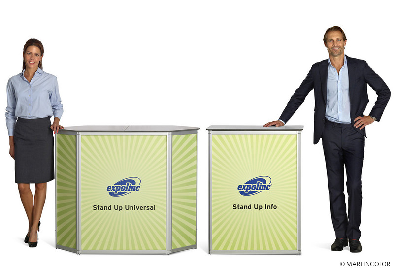 Die Stand Up-Theke des Markenherstellers Expolinc ist der ideale Meeting-Point bei Messen, Veranstaltungen und Events. Sie ist ein perfekte Platz, um Verkaufsgespräche zu führen und gleichzeitig bietet sie ausreichend Präsentationsfläche für Werbebotschaften und Logos. Die Stand Up-Theke ist in zwei Ausführungen erhältlich: Die rechtwinklig Stand Up Info-Theke oder die rautenförmige Universal-Theke. Beide Modelle bestehen aus einem Aluprofil mit integrierten Hartschaumplatten, die mit Grafik bedruckt werden können. Beide Thekenmodelle sind leicht zu montieren und besitzen eine stabile Konstruktion. Die Thekenplatte ist silbergrau. Im Lieferumfang enthalten ist auch ein Einlageboden und die Transporttasche.