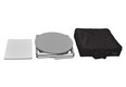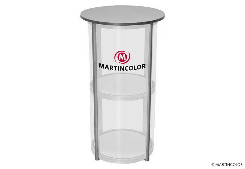 Bei der Twist Theke handelt es sich um eine außergewöhnliche Präsentationstheke, die sich sowohl als flexible Messetheke als auch als personalisierter Stehtisch verwenden lässt. Und der Clou: Die Twist Theke bzw. Stehtisch ist mit einer einzigen Drehbewegung einsatzfertig aufgebaut. Das System lässt sich komplett mit 8 bedruckbaren Click-Panels im Format 38,8 x50 cm bestücken. Alternativ kann man auch transparente Panels einsetzten und so Teile der Theke als Vitrine nutzen. Die Twist Theke verfügt über einen Einlegeboden, der mit der Thekenstruktur fest verbunden ist. Das Thekenmodell ist als Komplettsystem mit Tischplatte auf Kleinstmaß zusammenfaltbar! Der Transport der zusammengefalteten Theke erfolgt in einem Trolley. Twist besitzt einen Durchmesser von 58 cm und eine Höhe von 106 cm. Das Gewicht der Theke beträgt inkl. Grafik 18 kg. Die Belastbarkeit der Theke beträgt insg. 50 kg. Der Zwischenboden kann mit 15 kg belastet werden.